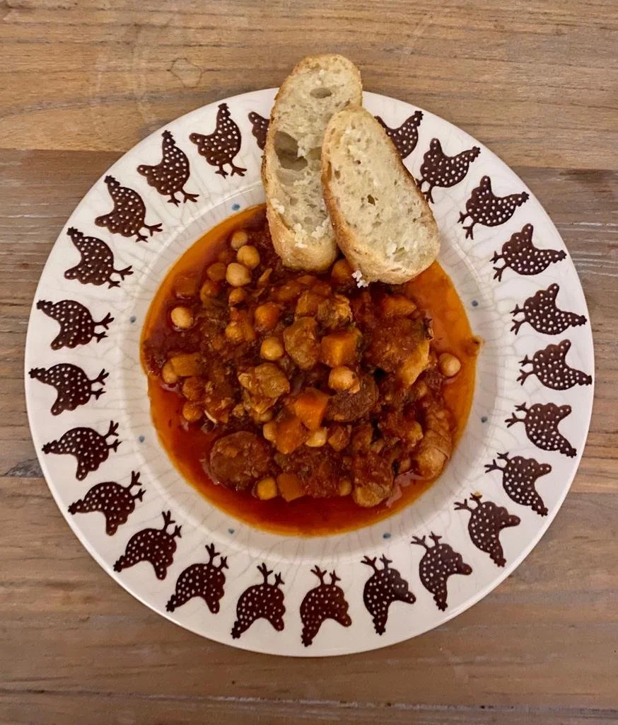 A Spanish-influenced casserole, with melt in your mouth slow-cooked belly pork, a rich tomato sauce, chorizo, chickpeas and spices.
